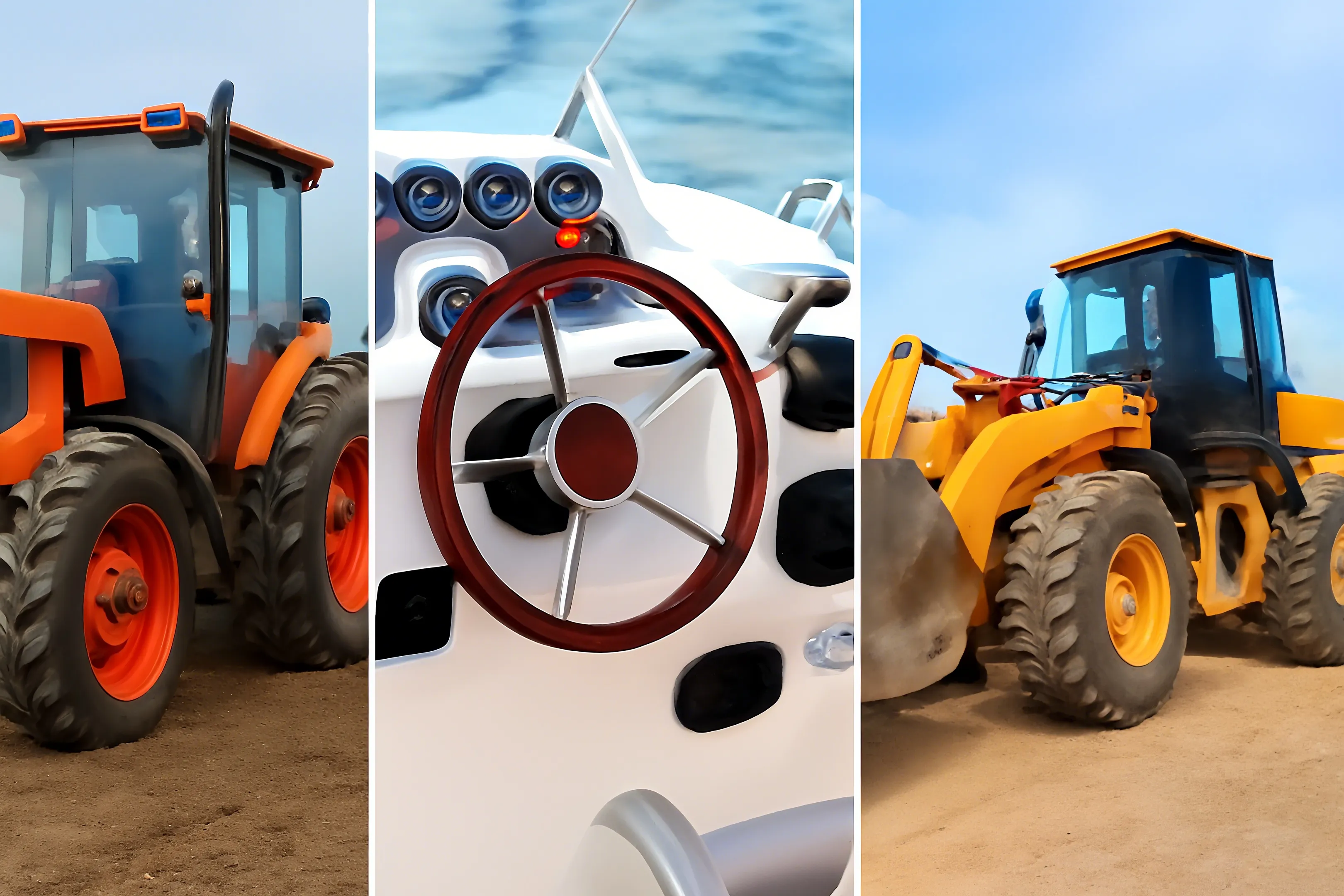 Ní feirmeacha agus báid amháin atá i gceist, áfach. Úsáidtear na sorcóirí seo freisin i bhfearas tógála, forklifts, meaisíní foraoiseachta agus lódairí. Sna meaisíní seo, cabhraíonn siad le stiúradh acastóra tosaigh nó cabhraíonn siad nuair a bhíonn fráma siúnta ag an bhfeithicil agus nuair a bhíonn gá léi a chur in iúl.