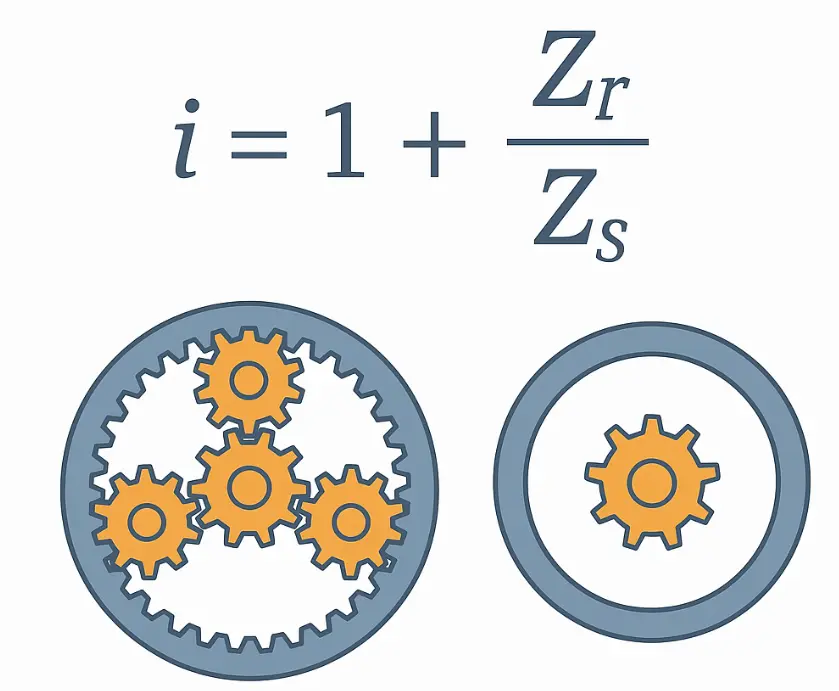 Níl an fhoirmle chun an cóimheas tarchurtha de laghdaitheoir pláinéadach a ríomh casta i ndáiríre. Is é an struchtúr is coitianta ná go bhfuil an fearas gréine gníomhach, tá an fáinne istigh socraithe, agus tá an t-iompróir phláinéid aschur. Faoin struchtúr seo, is é an fhoirmle chun an cóimheas tarchurtha a ríomh ná: