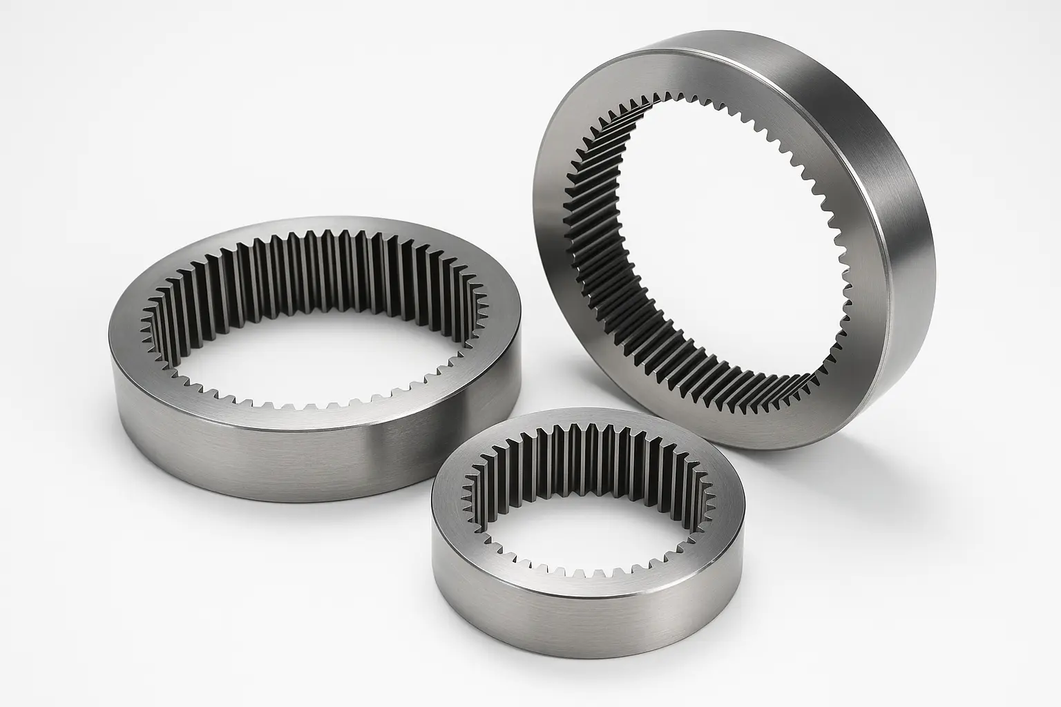 Tá ár bhFáinne Gear déanta as cruach cóimhiotail carburized, cruach teilgthe ard-neart nó ábhair chruach dhosmálta saincheaptha, agus déantar é a bhrionnú go beacht agus cóireáil teasa de réir an cháis úsáide. Is féidir le cruas an dromchla fiacail suas le HRC60 a bhaint amach. Ó thaobh na teicneolaíochta de, bainimid úsáid as naisc phróiseála ilchruinneas, mar shampla caitheamh CNC, bearradh próifíl fiacail, agus rádala trastomhas istigh fearas fáinne, agus úsáidimid an t-ionad tomhais fearas chun príomhthoisí a iniúchadh go hiomlán, mar shampla earráid treo fiacail agus rith amach gathacha chun a chinntiú gur féidir le gach táirge oibriú ard-mheaitseála agus saor ó chur isteach a bhaint amach leis an iompróir pláinéadach agus leis an bhfearas.