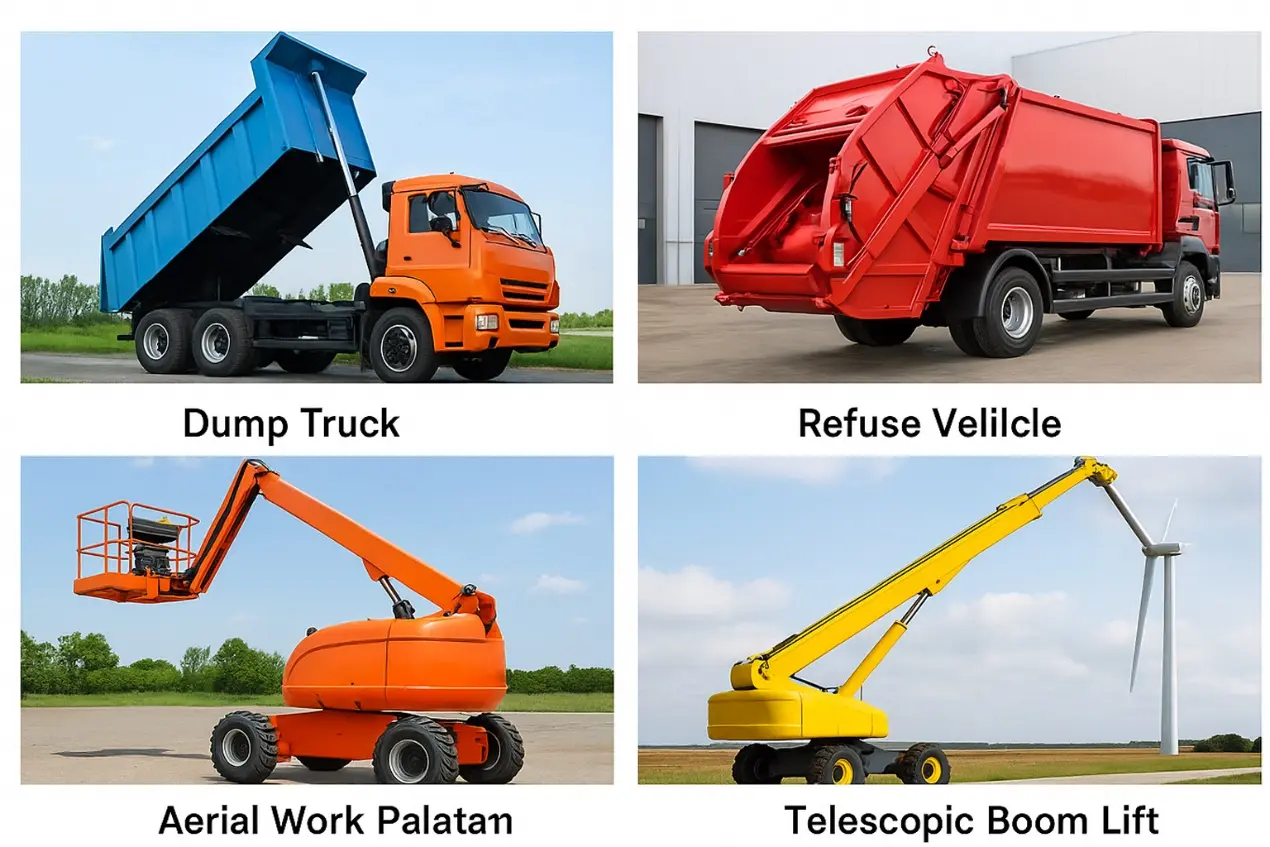 I trucailí dumpála, úsáidtear sorcóirí hiodrálacha ilchéime go minic chun an t-iompar a ardú chun dumpáil tapa ualaí troma a bhaint amach; i trucailí truflais sláintíochta, déanann sorcóirí hiodrálacha an córas oscailte agus comhbhrú clúdaigh chúl a thiomáint chun oibriú éifeachtach a chinntiú; in ardáin aeroibre amhail ardáin aerga nó trucailí siosúr, rialaíonn siad an lámh ardaithe agus ardaíonn siad an t-ardán oibriúcháin go cobhsaí; ina theannta sin, tá trucailí dumpála talmhaíochta, cláir tail hiodrálach leantóir, agus tiománaithe carn tógála ag brath freisin ar a saintréithe teileascópacha ilchéime iontaofa chun gníomhartha oibre a chur i gcrích.